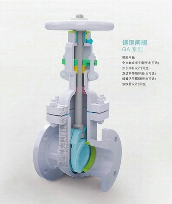 國標閘閥的啟閉件是閘板,閘閥閘板的運動方向與流體方向相垂直,國標閘閥只能作全開和全關,不能作調節和節流。大部分閘閥是采用強制密封的,即閥門關閉時,要依靠外力強行將閘板壓向閥座, 以保證密封面的密封性。閘板有兩個密封面,最常用的模式閘板閥的兩個密封面形成楔形、楔形角隨閘閥參數而異,通常為50,介質溫度不高時為2°52'。楔式國標閘閥的閘板可以做成一個整體,叫做剛性閘板;也可以做成能產生微量變形的閘板,以改善其工藝性,彌補密封面角度在加工過程中產生的偏差,這種閘板叫做彈性閘板。
