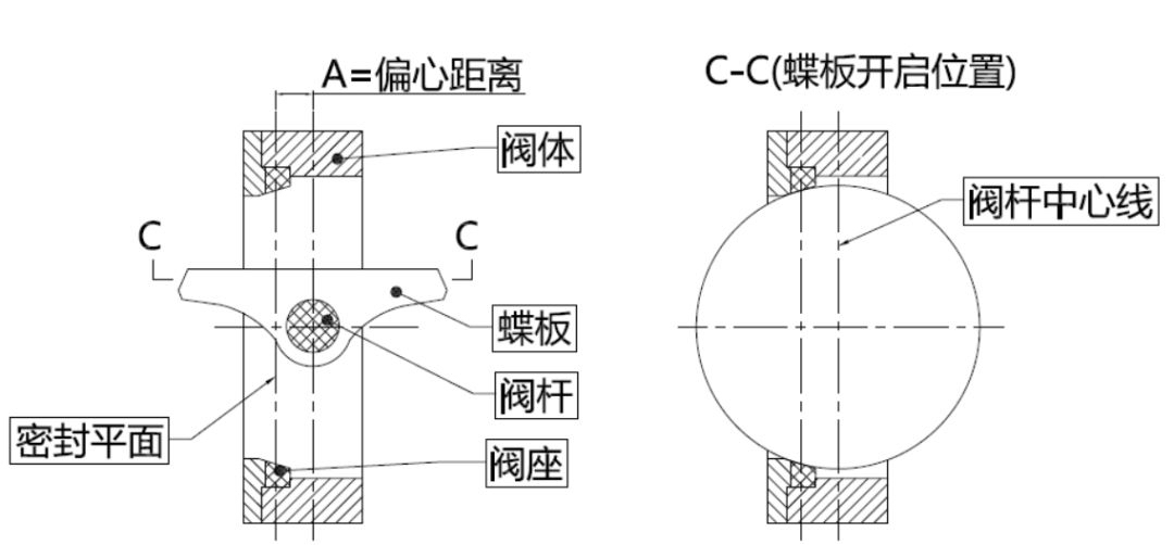 蝶板的閥桿中心與蝶板密封截面按A偏心設計,蝶閥在開啟過程中,蝶板密封面逐漸脫離閥座密封面;